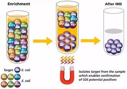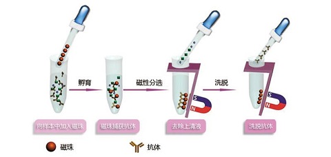 利用人工合成的內含鐵成分,可被磁鐵磁力所吸引,外有功能基團,可結合活性蛋白質(抗體)的磁珠,作為抗體的載體。當吸附在磁珠上的抗體與相應的微生物或特異性抗原物質結合后,則形成“抗原-抗體-磁珠免疫復合物”,這種復合物具有較高的磁響應性,在磁鐵磁力的作用下定向移動,使復合物與其他物質分離,而達到分離、濃縮、純化微生物或特異性抗原物質的目的。