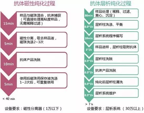 應用抗體(蛋白)包被的免疫磁珠純化技術無需復雜的層析設備,對樣品的澄清度無限制,只需要簡單的磁性吸附步驟即可很方便地從單抗表達產物中分離單抗,有效解決了傳統層析技術的不足之處。