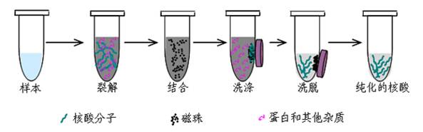 然后在外加磁場的作用下,復合物即分離出來。最后經過洗脫液洗去非特異性吸附的雜志、去鹽、純化后,即得到欲提取的核酸物質。
