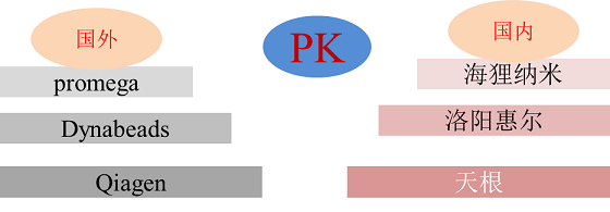 常用的磁珠法DNA提取試劑盒,目前主要為國外產品,例如Promega, Roche, DynaBeads,Qiagen等,且大多需要與專用儀器配套使用。