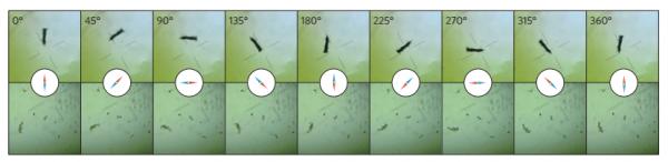 圖2. MagR在強磁場作用下指示南北,隨著磁場方向變化而改變自身方向。