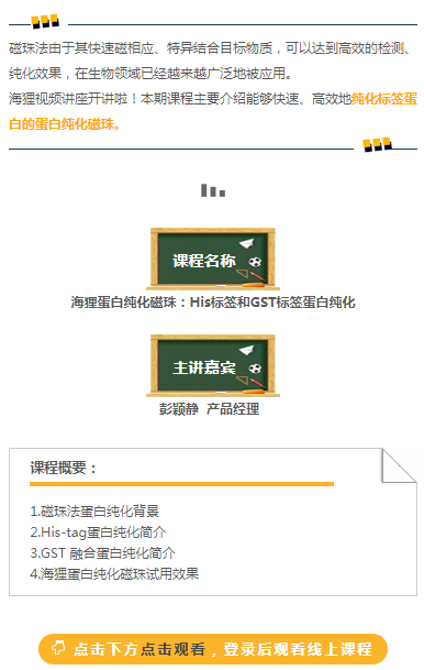 磁珠法由于其快速磁相應、特異結合目標物質,可以達到高效的檢測、純化效果,在生物領域已經越來越廣泛地被應用。 海貍首期直播課堂開課啦!本期課程主要介紹能夠快速、高效地純化標簽蛋白的方法——磁珠法。