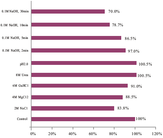 圖一、磁珠經不同溶液處理后結合生物素化分子的活性